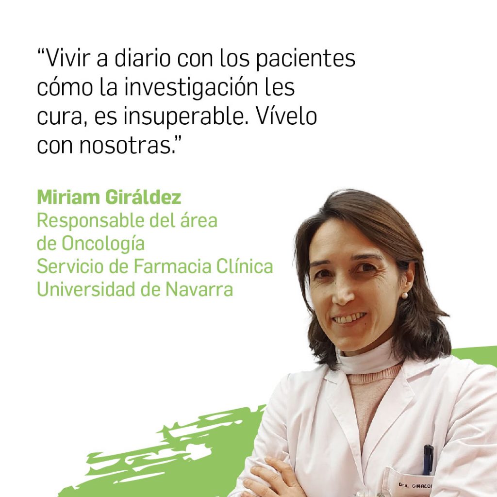 Licenciada en Farmacia (Universidad de Navarra) y especialista en Farmacia Hospitalaria (FIR) por la Clínica Universidad de Navarra. En 2008 se desplaza a Miami (Estados Unidos) donde completa el Fellowship Farmacia Oncológica en el Jackson Memorial Hospital. En 2009 traslada su residencia a Barcelona donde desarrolla su labor como farmacéutica oncológica en el Instituto Catalán de Oncología (ICO), de Hospitalet de Llobregat. Ha trabajado como farmacéutica experta en Oncología en el Hospital Gregorio Marañón de Madrid y el Instituto Catalán de Oncología (ICO), en Barcelona. Miriam es especialista en Oncología Farmacéutica: Board Certificate in Oncology Pharmacy (BCOP) de la American Society of Clinical Pharmacist (ACCP) y la Sociedad Americana de Farmacia Hospitalaria (ASHP) y es doctora Ciencias Biomédicas por la Universidad Complutense de Madrid. En la actualidad es responsable de la Unidad de Oncología del Servicio de Farmacia de la Clínica Universidad de Navarra y ha sido autora de números artículos científicos y ponente en el área de la Oncología Farmacéutica.