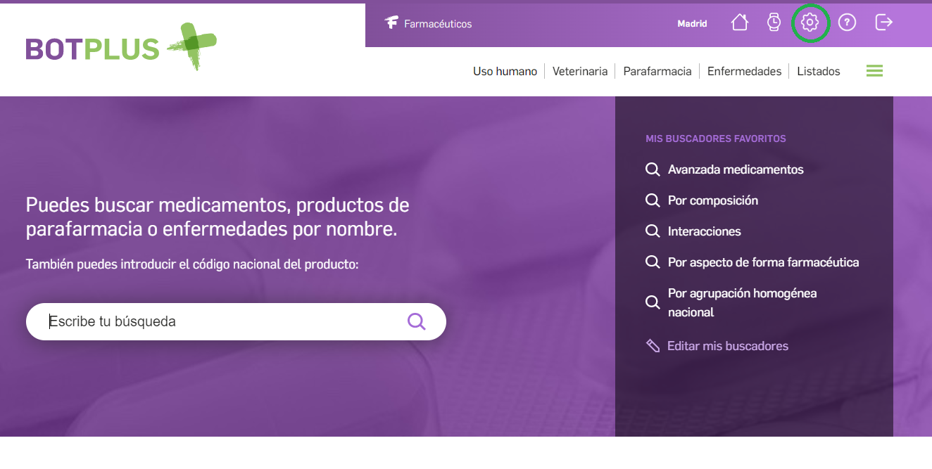 Para generar la clave KEY el usuario deberá acceder a la versión de BOT PLUS disponible en www.farmaceuticos.com con su usuario y contraseña, y una vez dentro de la herramienta, pulsar en el icono de configuración, en el menú superior de BOT PLUS.