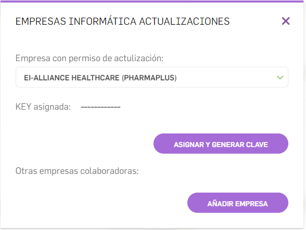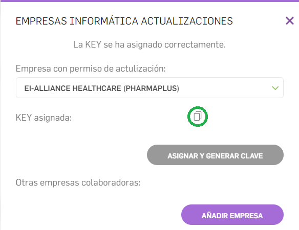 Una vez seleccionada la empresa, al pulsar al botón "ASIGNAR Y GENERAR CLAVE" se generará automáticamente la KEY asignada. Esta clave es la que tendrá que introducirse en el espacio que el proveedor informático haya habilitado en su programa de gestión para poder actualizar el programa con BOT PLUS. Debido a la longitud de la clave KEY, y con el objetivo de facilitar su introducción en el programa de gestión, esta clave puede copiarse pulsando para ello en el el icono que aparecerá a la de la clave.