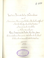 Portada del libro: Los tres reinos de la Naturaleza en el municipal de la villa de Puente Genil. Año 1882. Disponible en: https://bibliotecavirtual.ranf.com/es/catalogo_imagenes/grupo.do?path=4024785&presentacion=pagina&posicion=4®istrardownload=0