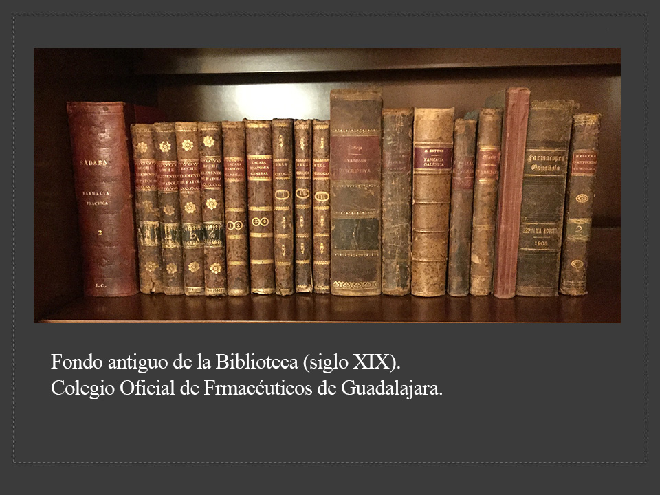 El Colegio de Farmacéuticos de Guadalajara dispone de la documentación generada durante su actividad: libros de actas y registros de colegiados. Conserva, además, una biblioteca con fondos del siglo XIX y una colección de retratos de quienes fueron presidentes de la corporación junto con óleo de Juan Rhodes Garrido (1881-1950), que fuera presidente de la Unión Farmacéutica Nacional.