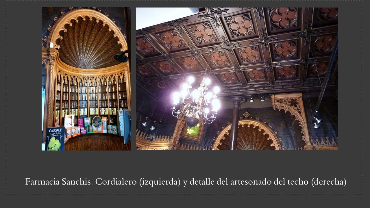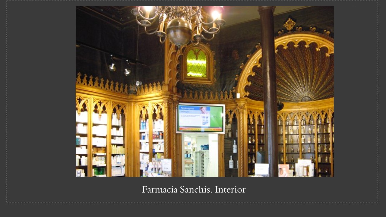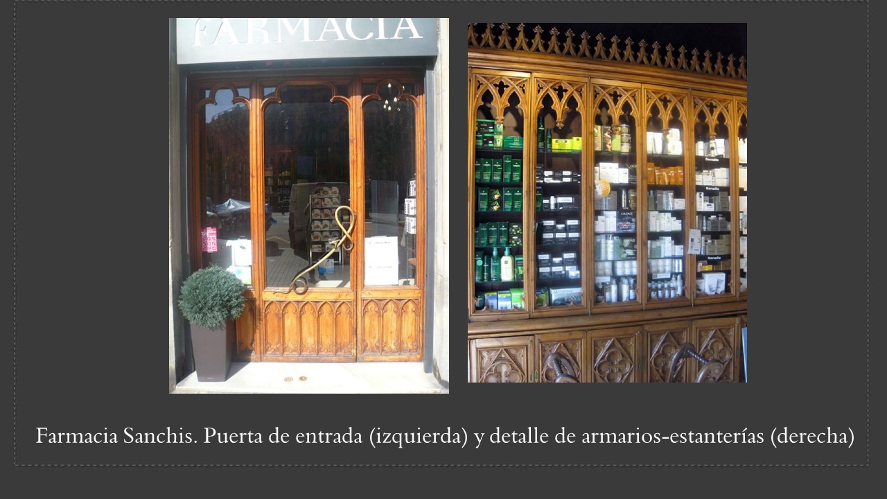 La Farmacia Tanganelli-Sanchís fue fundada por Frederic Vallet i Xiró en 1900; tras él fue ocupada por su hijo, Frederic Vallet i Mas, tras él la regentó su sobrino, Àngel Tanganelli Vallet; en la actualidad es propiedad de María del Mar Sanchis Foret. El edificio en que está ubicada se data hacia el año 1898. El exterior presenta tres huecos, enmarcados con carpintería barnizada y decoración neogótica; uno de ellos es un escaparate, mientras que los otras dos disponen de una puerta central batiente y un tirador exterior, de metal dorado, en forma de serpiente en actitud agresiva. El interior conserva un pilar de fundición, integrando la estructura del edificio, y elementos de decoración modernista de inspiración gótica que, salvo el pavimento y parte del cromatismo, se conserva íntegramente: el techo está realizado mediante una combinación de dos colores de madera y decoraciones sobrepuestas, con una moldura perimetral de diamantes y círculos en los plafones; en la parte superior de las estanterías se conserva una tela pintada que reviste toda la pared, con guirlandas florales; las paredes están cubiertas por armarios-estanterías de madera con bajos, plafones y rombos, vitrinas con puertas batientes con tracerías y cornisa con molduras y cresterías. El mostrador presenta el mismo motivo decorativo que los bajos de los armarios, y un sobre en mármol blanco; tras él mostrador, el mueble adopta forma de ábside, con un bóveda con decoración radial que conserva el cromatismo original (marrón oscuro con líneas doradas), a modo de cordialero. La iluminación procede de una antigua lámpara de hierro forjado.