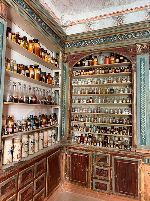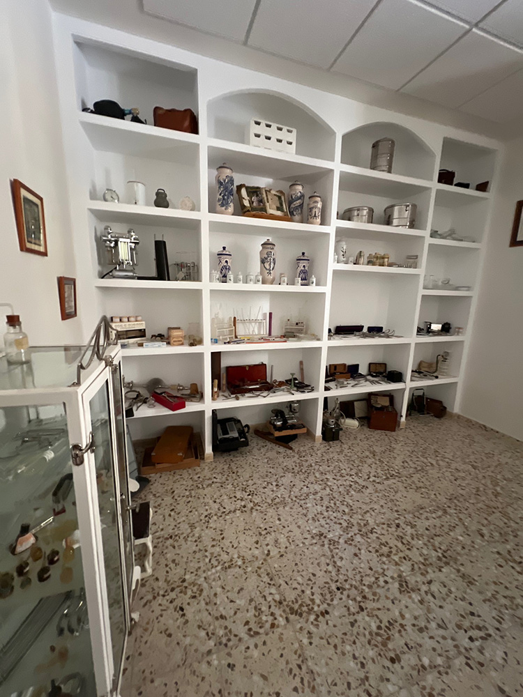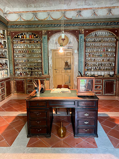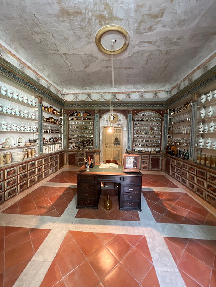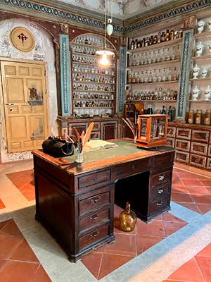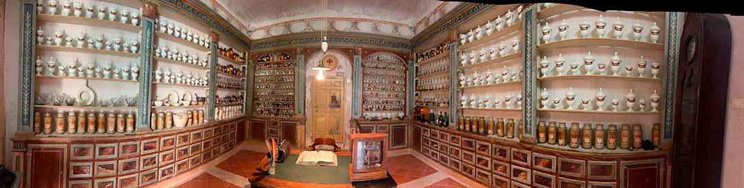 El Hospital de Santiago esta edificado sobre una elevación del terreno y fue construido en el siglo XlI, extramuros de la ciudad de Cuenca. Su ubicación estratégica hizo que protagonizara sucesos bélicos a lo largo de su historia. El edificio se reconstruyó en el siglo XVI, con planta cuadrangular y con un patio como nervio central. La fecha de reconstrucción data la existencia de la botica y rebotica del Hospital de Santiago. Se encuentra ubicada en el Claustro del edificio, preside el lateral noreste del Claustro junto a la Iglesia del Apóstol Santiago. Una doble puerta ojival de madera y cristal da acceso a un amplio espacio de estanterías y muebles de madera que contienen: botes de barro grande y pequeño, con la Cruz de Santiago, Romanas, Hornillos, Urnas vidriadas, Alambiques, Redomas, Orzas, Pulverillos, Morteros, Pesas, Hierbas y principios médicos, etc. Minerales, gomas, resinas (incienso, mirra, opio, resina de pino, etc.), plantas (muérdago, eneldo, ciprés, salvia, menta, etc.) se distribuyen en polvos y líquidos de mezclas curativas, sabiamente depositadas en recipientes con su etiqueta identificativa. En dicho espacio también se muestra instrumental médico de la época que satura el espacio de la botica, ya enriquecido con sus cientos de frascos de pócimas farmacéuticas y recipientes de cristal, loza, porcelana y barro, con los que se dotaban las boticas de entonces. El espacio muestra dos relojes de la época: uno de pie y otro de pared, ambos aportan a la botica su esencia del tiempo pausado, que requería la elaboración de las pócimas; una luz espectral que focaliza a la concentración de medidas exactas en su mesa central. Un techo y laterales con pintura delicada de cortinas en pliegues y colores cálidos recogen el halo matemático y natural de este espacio.