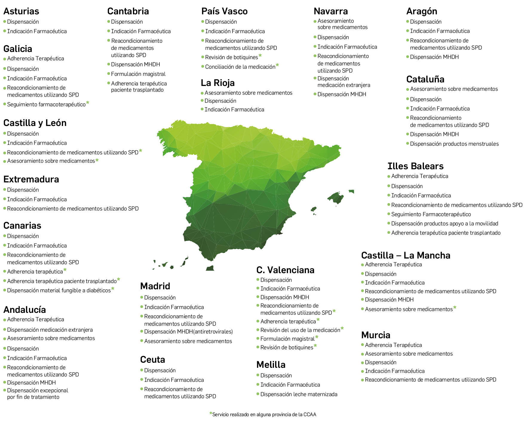 Estos SPFA pueden prestarse de manera aisladas por las farmacias o bajo programas específicos desarrollados por la Organización Colegial, tanto a nivel nacional, autonómico o de manera provincial.