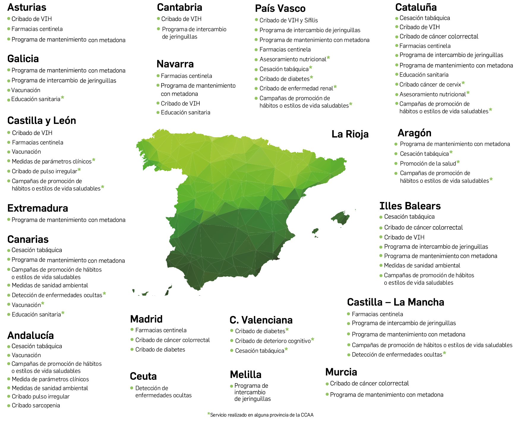 Entre estos SPFA destacan los programas de mantenimiento con metadona a usuarios de drogas por vía parenteral, que se lleva implementando desde los años 90 en 11 Autonomías, la Educación Sanitaria y Campañas de promoción de hábitos o estilos de vida saludables en 8 Autonomías o los Cribados de VIH o cáncer de colon entre otros.