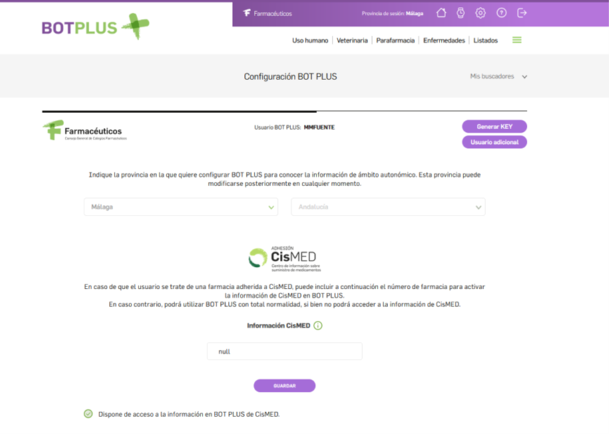 Las farmacias adheridas pueden consultar determinada información de CisMED en la ficha de los medicamentos. Para poder acceder a esta información debe incluirse en primer lugar el número de farmacia de CisMED en la pantalla de configuración de BOT PLUS, a donde se accede a través del pictograma de ajustes localizado en la parte superior de la pantalla.