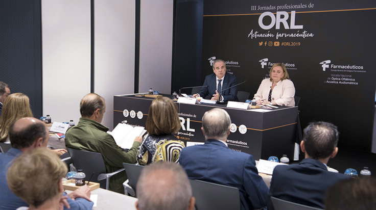 Madrid, 10 de octubre de 2019.- El presidente del Consejo General de Colegios de Farmacéuticos, Jesús Aguilar. y la vocal nacional de Óptica Oftálmica y Acústica Audiométrica, María Isabel de Andrés, han sido los encargados de inaugurar en la mañana de hoy las III Jornadas Profesionales de Actuación Farmacéutica en ORL. El encuentro, que reúne en Madrid a 150 farmacéuticos de toda España, tiene como objetivo ampliar los conocimientos de los farmacéuticos en el ámbito de las patologías, de oído, nariz y laringe (ORL).
