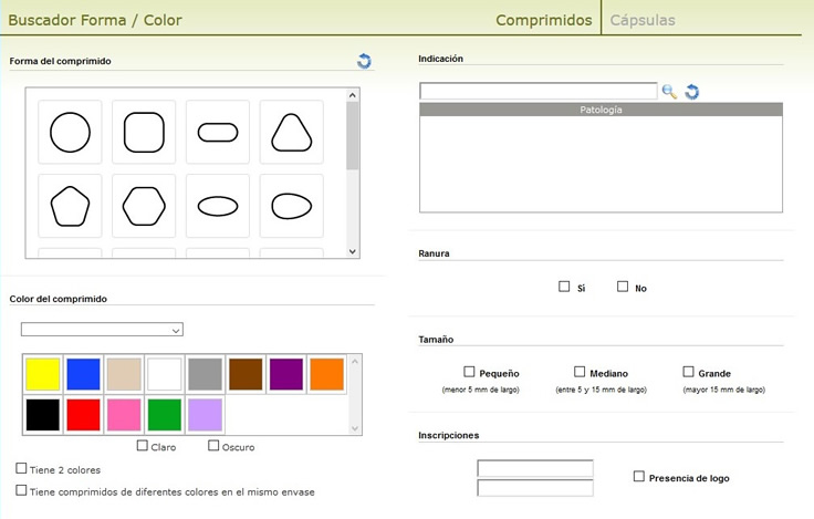 - Color: permite seleccionar el color del comprimido entre las posibles opciones disponibles con la posibilidad de matizar la tonalidad del color (claro/oscuro). Si el comprimido tiene dos colores o la presentación dispone de comprimidos de distintos colores también permite seleccionarlo.