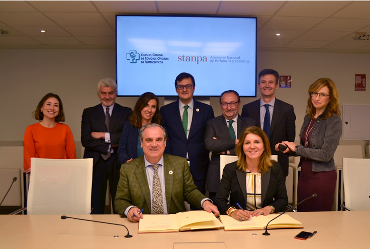 Madrid, 26 de abril de 2019.- El presidente del Consejo General de Farmacéuticos, Jesús Aguilar, y la directora general de la Asociación Nacional de Perfumería y Cosmética (STANPA), María del Val Díez, han suscrito un convenio de colaboración con el objetivo de promover la formación e información entre profesionales y usuarios en relación con los productos de Dermofarmacia.