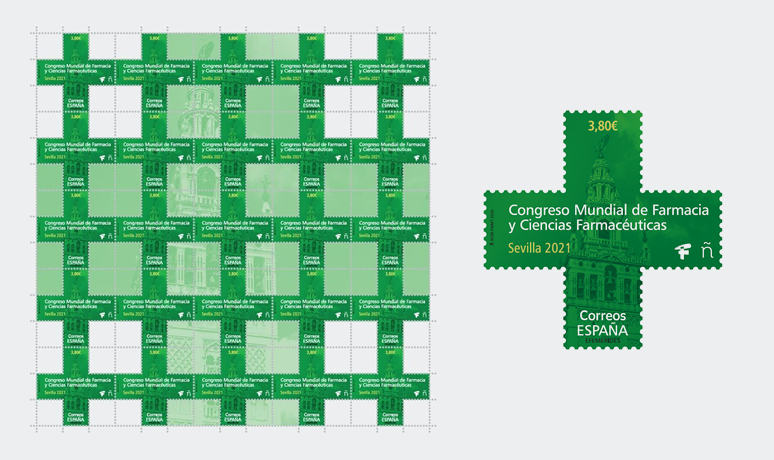 Correos ha emitido el sello con motivo de la celebración en Sevilla del Congreso Mundial de Farmacia y Ciencias Farmacéuticas. El Congreso estaba previsto para el mes de septiembre de este año, pero a causa de la pandemia de la COVID-19, su celebración se ha aplazado a los días 12 - 16 de septiembre de 2021 .