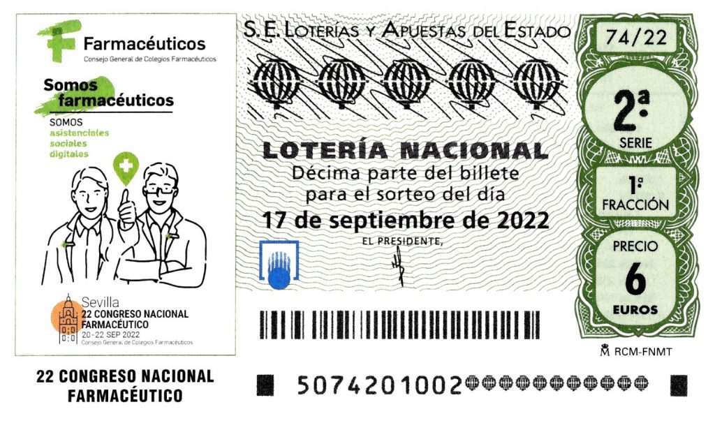 Loterías y Apuestas del Estado dedicará el décimo del sábado, 17 de septiembre, al 22 Congreso Nacional Farmacéutico que se celebrará del 20 al 22 de septiembre en Sevilla, conjuntamente con el 80 Congreso Mundial de Farmacia y Ciencias Farmacéuticas. Ambas cita profesionales congregarán en España a más de 5.000 profesionales convirtiéndose en la capital mundial de la Farmacia.