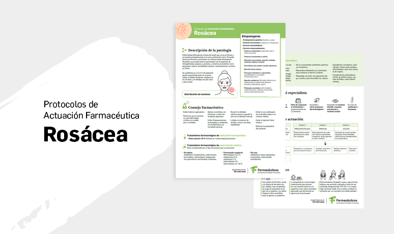 La rosácea es una causa frecuente de consulta en la farmacia comunitaria. Por este motivo, la Vocalía Nacional de Dermofarmacia del Consejo General de Colegios Farmacéuticos ha publicado un nuevo protocolo de actuación farmacéutica con el fin de ayudar a los farmacéuticos en su ejercicio profesional diario, con información sencilla y de utilidad, así como con mensajes clave para el asesoramiento farmacéutico y un algoritmo de actuación para la derivación al médico cuando sea necesario.