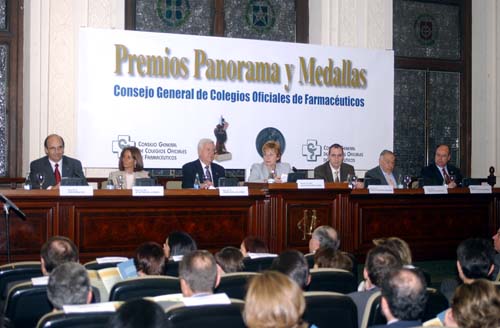 Madrid, 20 de marzo de 2002. La Ministra de Sanidad y Consumo, Celia Villalobos, presidió la entrega de los Premios Panorama del Medicamento y de las Medallas del Consejo General, que con carácter anual concede el Consejo General de Colegios Oficiales de Farmacéuticos. Para Pedro Capilla, Presidente del Consejo General de Colegios Oficiales de Farmacéuticos: "Hoy es un día entrañable para los farmacéuticos, en el que el Consejo General desea homenajear al farmacéutico y al medicamento, dos elementos claves en nuestra sociedad actual". La entrega de los Premios Panorama y de las Medallas del Consejo reúne a representantes de la Administración, la industria y del mundo de la farmacia. Cuatro farmacéuticos y cuatro principios activos son los protagonistas del acto que hoy se celebra en el Casino de Madrid.