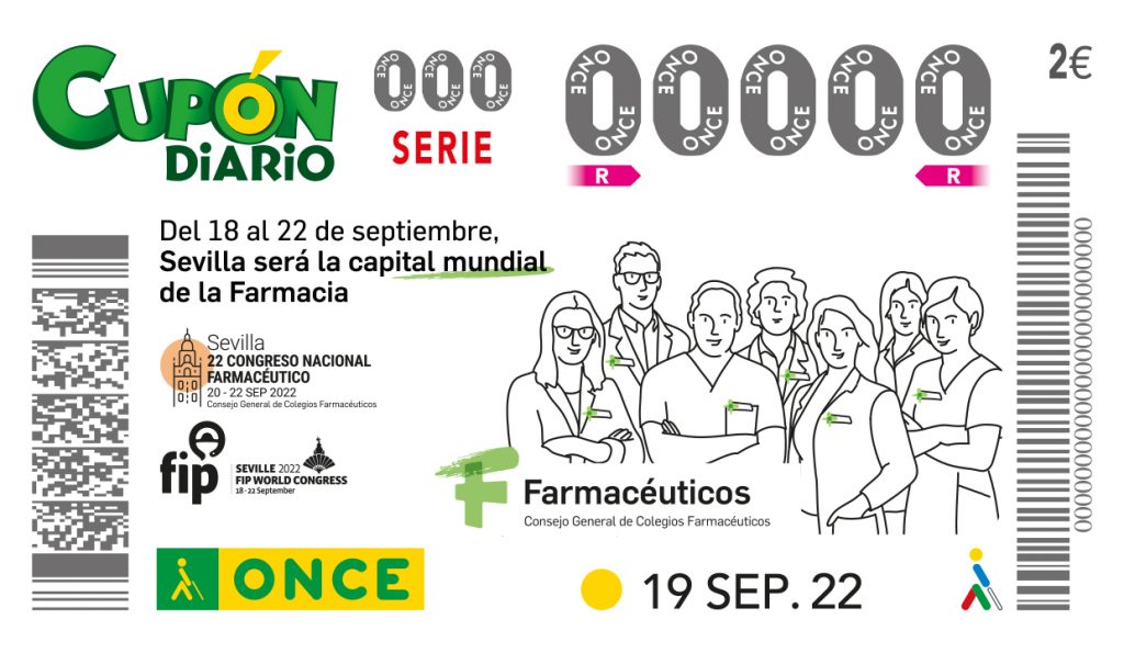 El 80 Congreso Mundial de Farmacia y el 22 Congreso Farmacéutico Nacional protagonizan el cupón de la ONCE del lunes 19 de septiembre. Cinco millones de cupones difundirán ambos eventos que se celebrarán en Sevilla del 18 al 22 de septiembre, y en los que se presentará este cupón. El 80 Congreso Mundial de Farmacia, organizado por la Federación Internacional Farmacéutica (FIP), cuenta con la participación del Consejo General de Colegios Oficiales de Farmacéuticos. El 22 Congreso Nacional Farmacéutico está organizado por el Consejo General de Farmacéuticos en colaboración con el Colegio de Farmacéuticos de Sevilla.