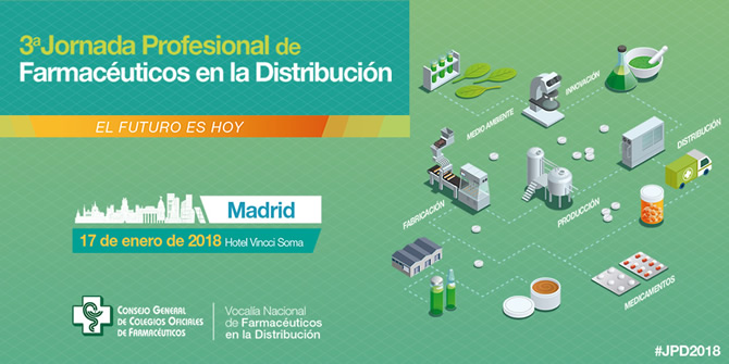 Madrid, 19 de diciembre de 2017.- El próximo 17 de enero se celebrará en Madrid la Jornada Profesional de Distribución Farmacéutica, organizada por el Consejo General de Colegios Farmacéuticos, a través de la vocalía nacional de Distribución. Durante la jornada – que se desarrollará bajo el lema “El futuro es hoy” – se abordarán en varias mesas redondas y conferencias los retos a los que hará frente la distribución farmacéutica en los próximos años.
