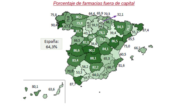 El porcentaje de farmacias ubicadas en capital de provincia disminuye cada año como consecuencia, principalmente, de la dinámica geográfica, así el 83,7% de las aperturas de farmacia en 2017 se produjeron en municipios que no son capital de provincia. Además, hay una media de 2,3 farmacéuticos por farmacia.