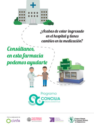 El programa “Concilia Medicamentos” está formado por el Consejo General de Colegios Oficiales de Farmacéuticos, miembros de Foro de Atención Farmacéutica en Farmacia Comunitaria*, la Sociedad Española de Farmacia Hospitalaria (SEFH), la Universidad de Salamanca, los Colegios de Farmacéuticos y las farmacias participantes de Asturias, Granada, Pontevedra y Salamanca y los servicios de farmacia del Hospital San Agustín de Avilés, Hospital Virgen de las Nieves de Granada, Hospital Álvaro Cunqueiro de Vigo y el Hospital Universitario de Salamanca. Este proyecto cuenta con la colaboración de laboratorios Cinfa.