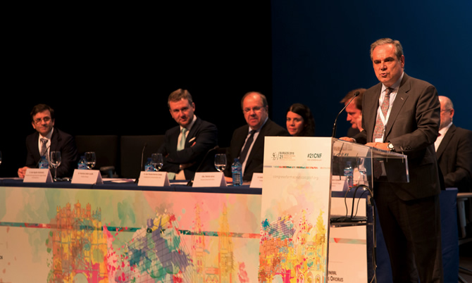 Burgos, 3 de octubre 2018 - Este miércoles se ha inaugurado en Burgos el 21 Congreso Nacional Farmacéutico, en un acto presidido por el presidente de la Junta de Castilla y León, Juan Vicente Herrera, y que también ha contado las intervenciones del alcalde de Burgos, Francisco Javier Lacalle; de la directora general de Cartera Básica de Servicios SNS y Farmacia del Ministerio de Sanidad, Consumo y Bienestar Social, Patricia Lacruz Gimeno; del presidente del Consejo General de Colegios Oficiales de Farmacéuticos, Jesús Aguilar; el presidente del Consejo de Colegios Profesionales de Farmacéuticos de Castilla y León, Carlos Treceño; y el presidente del Colegio Oficial de Burgos, José Miguel, López de Abechuco.