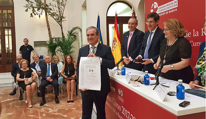 Murcia, 10 de julio de 2018.- La Academia de Farmacia Santa María de España de la Región de Murcia y el Colegio Oficial de Farmacéuticos clausuraron en la tarde de ayer su curso académico 2017-2018, en un acto que tuvo lugar en el Real Casino de Murcia. En el transcurso del mismo tomó posesión como académico Jesús Aguilar Santamaría, presidente del Consejo General de Colegios Oficiales de Farmacéuticos de España, y actualmente presidente de la Agrupación Farmacéutica Europea.