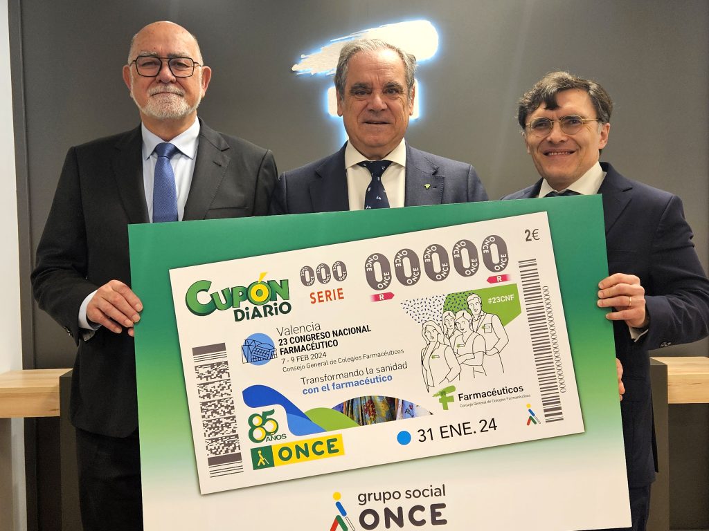 El presidente del Consejo General de Farmacéuticos, Jesús Aguilar, el presidente del Muy Ilustre Colegio Oficial de Farmacéuticos de Valencia (MICOF), Jaime Giner, y Alberto Durán, vicepresidente de la Fundación ONCE, han presentado la lámina del cupón que incorpora el lema de esta edición, ‘Transformando la Sanidad con el farmacéutico’.