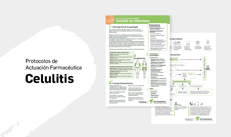 La Vocalía Nacional de Dermofarmacia ha publicado, dentro de la serie de protocolos de actuación farmacéutica que elabora periódicamente, una nueva infografía con pautas prácticas sobre el asesoramiento en los casos de celulitis.