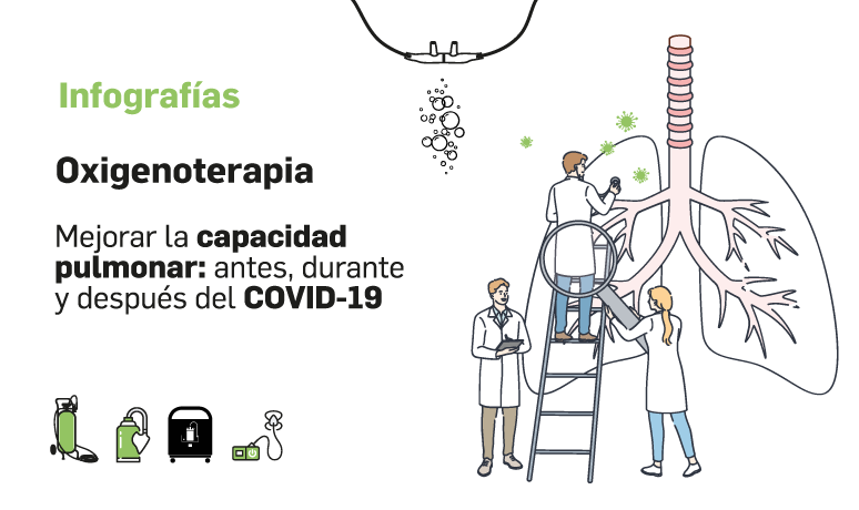 La infografía publicada recoge consejos para que los pacientes puedan saber emplear el pulsioxímetro y conocer en qué momento la necesitan y deben acudir a urgencias. También, los tipos de oxígeno que existen actualmente como tratamiento, las medidas de mantenimiento e higiene, así como las recomendaciones de seguridad.