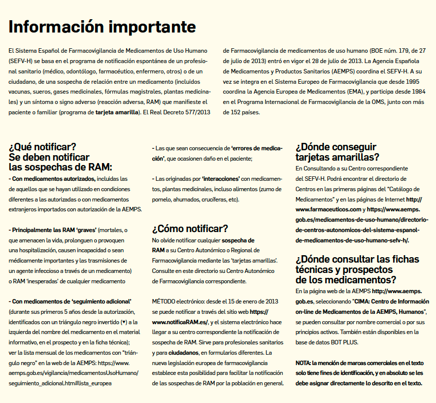 Esta información que se incorpora a las fichas técnicas y prospectos de los medicamentos supone una actualización permanente, por lo que es necesario consultar sus datos y la fecha de la actualización (que figura al final del texto de las fichas técnicas y prospectos), cuando se consultan en la web de la AEMPS (sección CIMA: Centro de Información Online de Medicamentos).