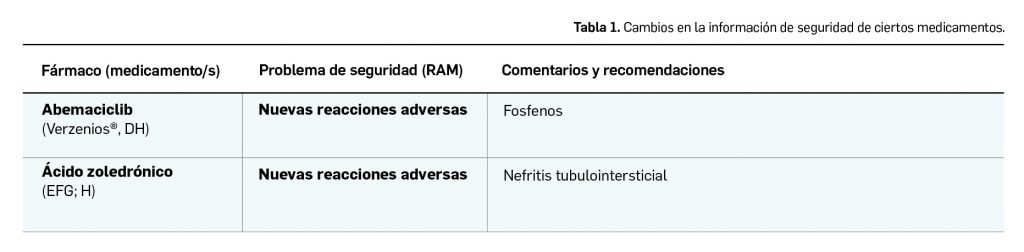 El Comité Europeo para la Evaluación de Riesgos en Farmacovigilancia (PRAC) ha acordado cambios en las fichas técnicas y los prospectos de los siguientes medicamentos, siendo los más importantes los que se describen en la Tabla 1, según informa la AEMPS en su Boletín mensual de Seguridad de Medicamentos de Uso humano de los meses de abril (AEMPS, 2024a) y de mayo de 2024 (AEMPS, 2024b). Las fichas técnicas y prospectos de los medicamentos pueden consultarse en la web de la AEMPS, dentro de la sección CIMA: Centro de Información Online de Medicamentos (https://cima.aemps.es/cima/).