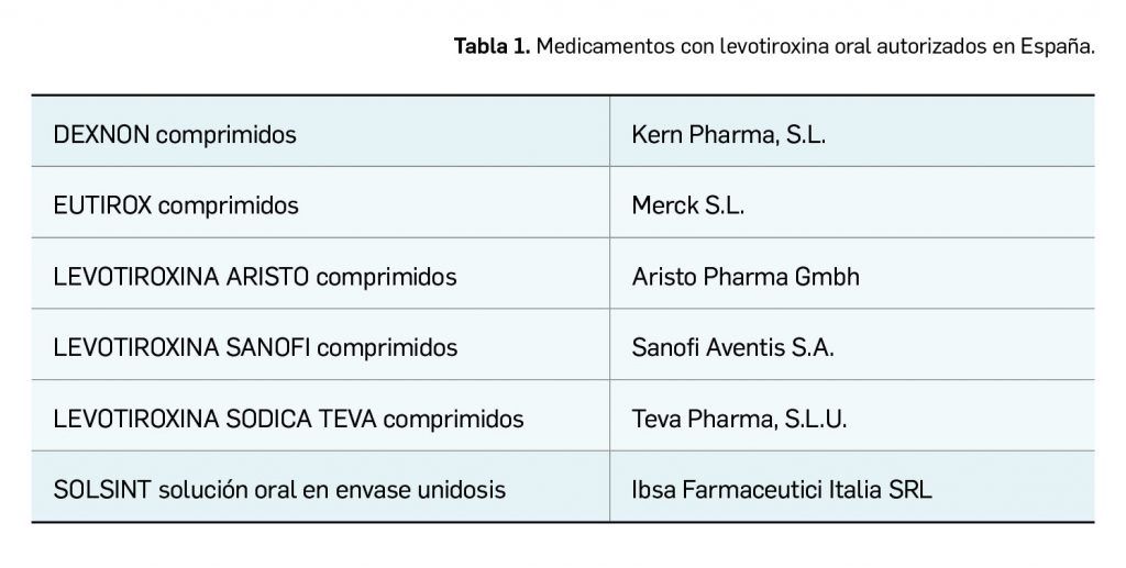 En España existen, a fecha de 31 de enero de 2023, los siguientes medicamentos con levotiroxina por vía oral (Tabla 1):
