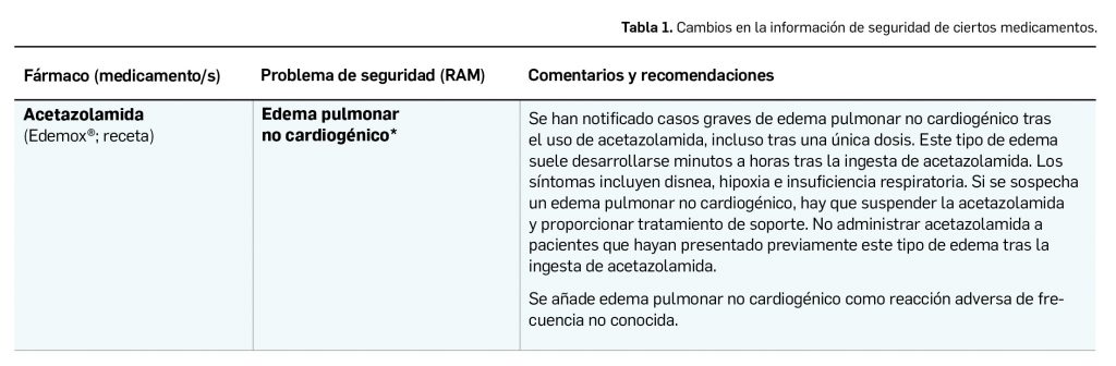 El Comité Europeo para la Evaluación de Riesgos en Farmacovigilancia (PRAC) ha acordado cambios en las fichas técnicas y los prospectos de los siguientes medicamentos, siendo los más importantes los que se describen en la Tabla 1, según informa la AEMPS en su Boletín mensual de Seguridad de Medicamentos de Uso humano de los meses de julio y agosto de 2024 (AEMPS, 2024). Las fichas técnicas y prospectos de los medicamentos pueden consultarse en la web de la AEMPS, dentro de la sección CIMA: Centro de Información Online de Medicamentos (https://cima.aemps.es/cima/).