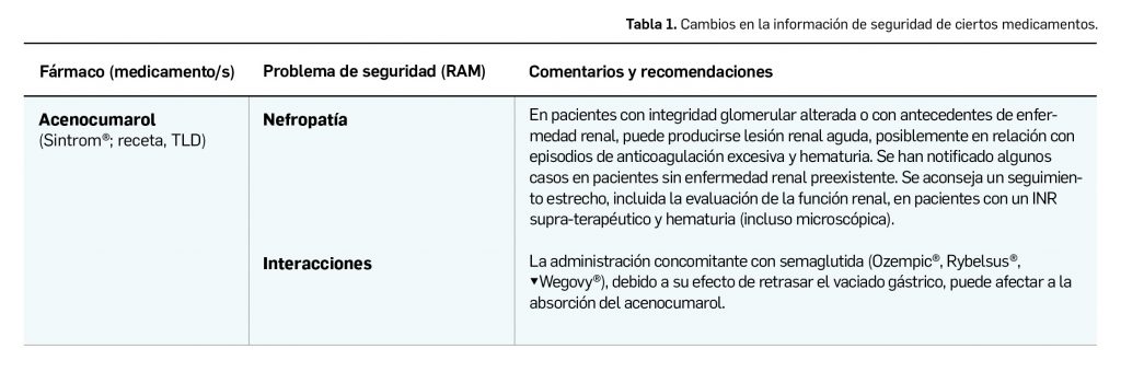 El Comité Europeo para la Evaluación de Riesgos en Farmacovigilancia (PRAC) ha acordado cambios en las fichas técnicas y los prospectos de los siguientes medicamentos, siendo los más importantes los que se describen en la Tabla 1, según informa la AEMPS en su Boletín mensual de Seguridad de Medicamentos de Uso humano del mes de enero de 2025 (AEMPS, 2025).