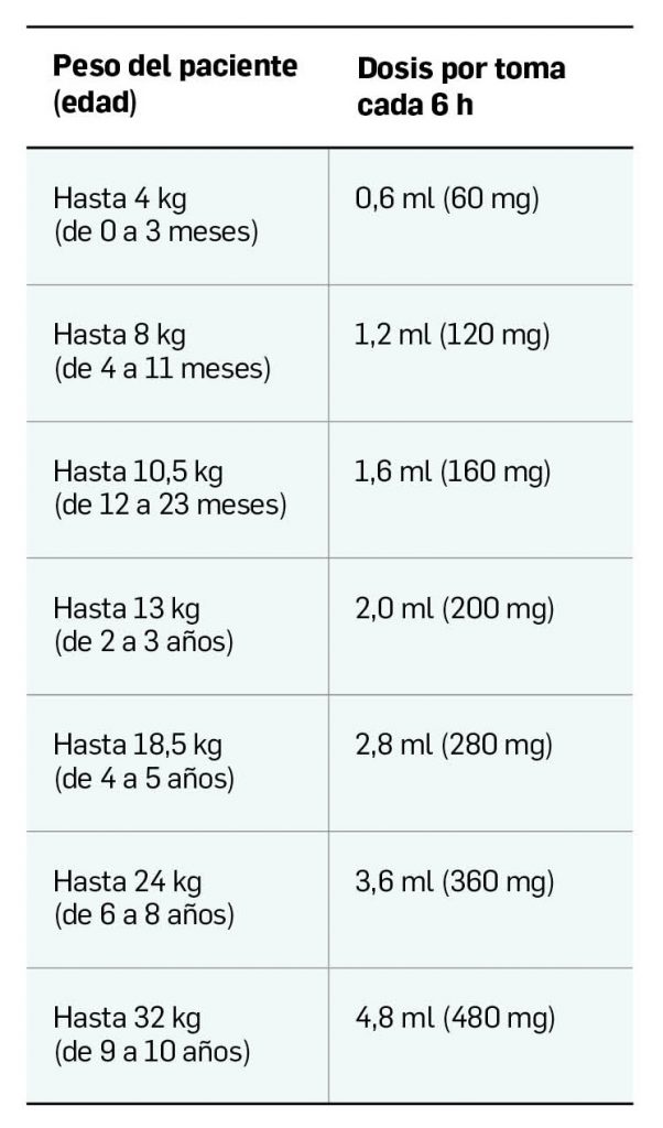La dosis pediátrica diaria recomendada de paracetamol es aproximadamente de 60 mg/kg/día, que se reparte en 4 o 6 tomas diarias, es decir 15 mg/kg cada 6 horas o 10 mg/kg cada 4 horas. Para la administración de 15 mg/kg cada 6 horas, la pauta es la siguiente: