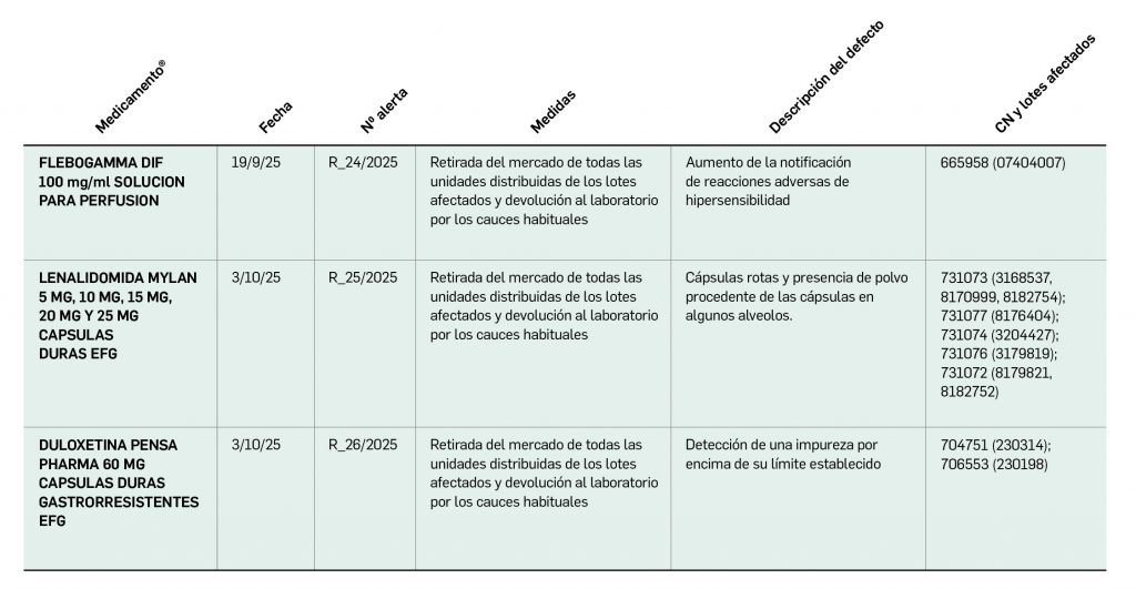 Alertas debidas a defectos de calidad observados en medicamentos de uso humano, publicadas por la AEMPS desde el anterior número y que suponen la retirada o inmovilización de ciertos lotes de medicamentos. En BOT PLUS puede encontrar más información detallada, con acceso al documento de la AEMPS.