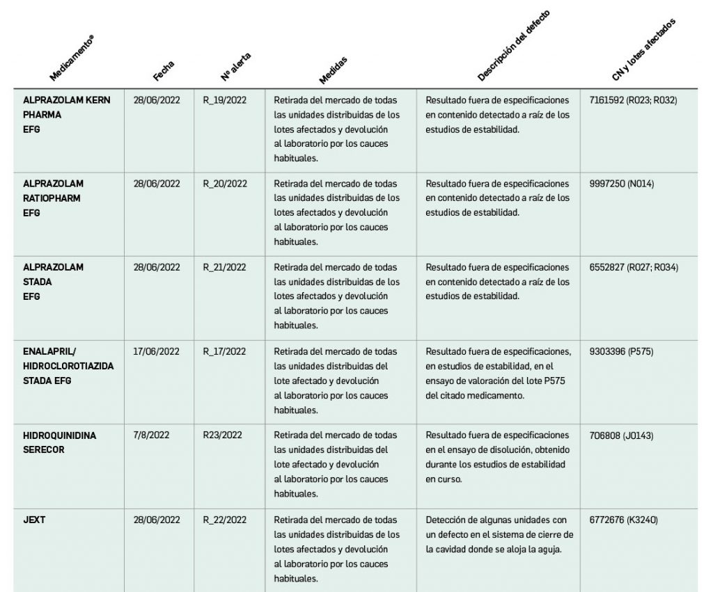 Alertas debidas a defectos de calidad observados en medicamentos de uso humano, publicadas por la AEMPS desde el anterior número y que suponen la retirada o inmovilización de ciertos lotes de medicamentos. En BOT PLUS puede encontrar más información detallada, con acceso al documento de la AEMPS.