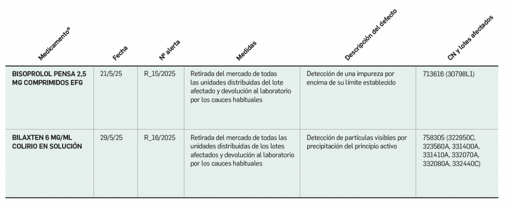 Alertas debidas a defectos de calidad observados en medicamentos de uso humano, publicadas por la AEMPS desde el anterior número y que suponen la retirada o inmovilización de ciertos lotes de medicamentos. En BOT PLUS puede encontrar más información detallada, con acceso al documento de la AEMPS.