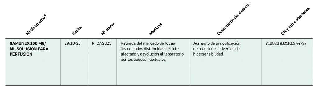 Alertas debidas a defectos de calidad observados en medicamentos de uso humano, publicadas por la AEMPS desde el anterior número y que suponen la retirada o inmovilización de ciertos lotes de medicamentos. En BOT PLUS puede encontrar más información detallada, con acceso al documento de la AEMPS.