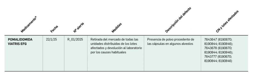 Alertas debidas a defectos de calidad observados en medicamentos de uso humano, publicadas por la AEMPS desde el anterior número y que suponen la retirada o inmovilización de ciertos lotes de medicamentos. En BOT PLUS puede encontrar más información detallada, con acceso al documento de la AEMPS.