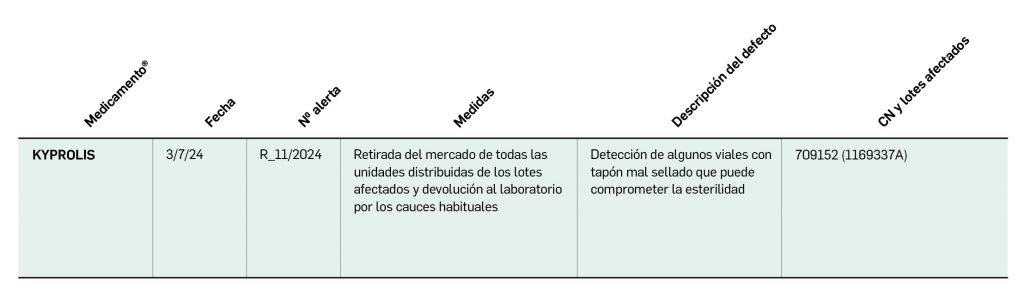 Resumen de las notas sobre seguridad y farmacovigilancia publicadas por la AEMPS desde principios del año 2024. Para información más ampliada y acceso al documento de la AEMPS, puede consultar BOT PLUS.