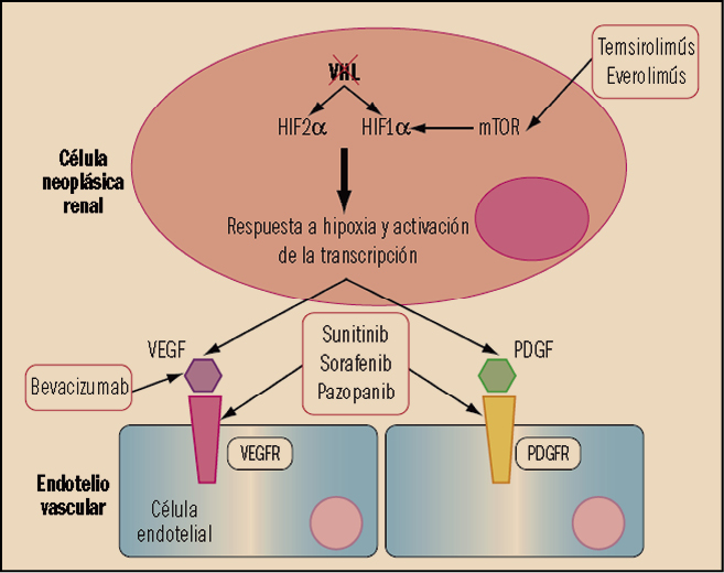 El supresor tumoral VHL se inactiva por mutación o silenciamiento epigenético en aproximadamente el 80% de los casos esporádicos de carcinoma renal de células claras (CRCC). La deficiencia de VHL en CRCC impulsa la angiogénesis, la invasión local y la metástasis mediante la activación de la respuesta hipóxica regulada por el factor inducible por hipoxia (hypoxia-inducible factor, HIF). A concentraciones bajas de oxígeno, los factores de transcripción HIF1α/HIF2α inducen la expresión de genes de respuesta hipóxica incluyendo factores angiogénicos tales como VEGF y PDGF (factor de crecimiento derivado de plaquetas; Platelet-derived Growth Factor), proteínas pro-invasoras que promueven la transición epitelial-mesenquimal y enzimas que facilitan el metabolismo anaeróbico. En condiciones normales (normoxia), VHL dirige a HIF1α/HIF2α para su degradación dependiente de ubiquitina por el proteasoma. Sin embargo, la pérdida de la función VHL conduce a la estabilización de los factores de transcripción HIF y la consiguiente expresión de sus genes diana. En células tumorales deficientes en VHL y células endoteliales el HIF2α es el principal regulador positivo de la tumorigénesis y la angiogénesis, en lugar de HIF1α. La activación de la señalización de VEGFR como resultado de la deficiencia de VHL subyace a la actividad clínica de agentes antiangiogénicos en CRCC.