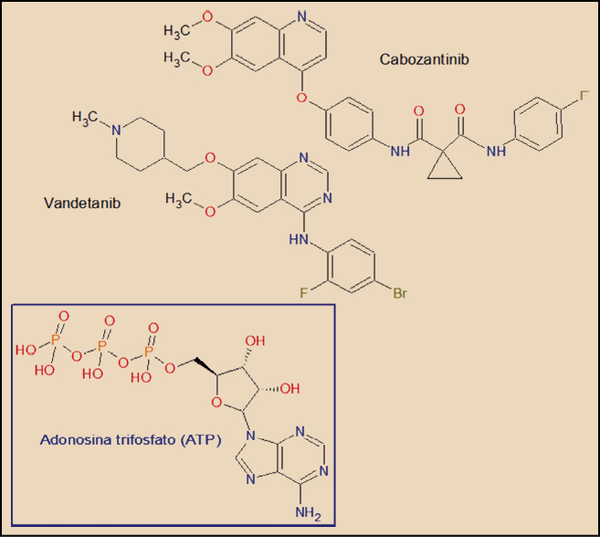 El cabozantinib está estrechamente relacionado estructural y farmacológicamente con otros miembros de la serie de inhibidores de proteína cinasas y, en particular con el vandetanib. Como otros miembros de la serie de inhibidores de proteína cinasas, es el resultado de la optimización funcional mediante modelización molecular a partir de una serie de 2-fenilaminopirimidinas, de donde surgió el imatinib, cabeza de serie del grupo. En cualquier caso, todos ellos guardan – en mayor o menor grado – una familiaridad química con la molécula de ATP (o, en su caso, con la de GTP, como sucede en las cinasas MAPK), con la que compiten para provocar el bloqueo de la cinasa correspondiente.