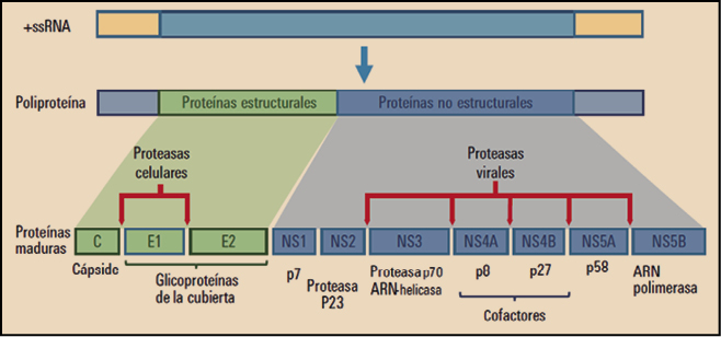 La expresión del ARN del VHC utiliza la maquinaria genética de los hepatocitos humanos; para ello, induce la síntesis de una única proteína o poliproteína(C-E1-E2-p7-NS2-NS3-NS4A-NS4B-NS5A-NS5B), formada por 3.011 aminoácidos, lo que implica la necesidad de que varias proteasas celulares y virales (NS2 y NS3, junto con su cofactor NS4A, que forman parte de la propia poliproteína) actúen para liberar las formas activas de las 3 proteínas estructurales (E) y de las 7 no estructurales (NS) que la constituyen (Figura 1).