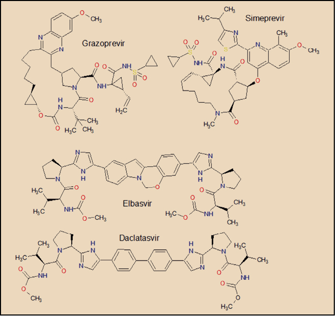 Por su parte, el grazoprevir está farmacológica y estructuralmente relacionado con el paritaprevir y, en especial, con el simeprevir, inhibidores específicos del complejo de serina proteasa NS3/4A. Estructuralmente destaca la presencia de varios grupos amida que confieren a estas moléculas un carácter de falso péptido, lo que resulta necesario para incorporarse – y bloquear – a determinadas regiones de la proteasa NS3/NS4A. También es peculiar la presencia de una estructura química relativamente compleja caracterizada por la presencia de un anillo con un elevado número de eslabones (macrociclo), de 18 eslabones en el grazoprevir, de 14 en el caso del simeprevir y de 15 en el del paritaprevir. Ambas estructuras también presentan estructuras anulares (ciclopropano, ciclopentano o pirrolidina) que quedan integradas en el macrociclo.
