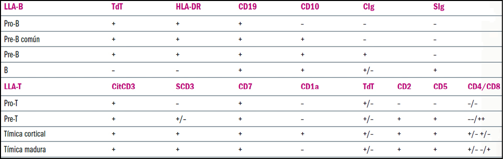 En realidad, se trata de una enfermedad heterogénea en la cual la transformación y expresión clonal puede ocurrir a diferentes etapas de la diferenciación linfoide. Por ello, la anterior clasificación está muy simplificada, ya que existen diferentes subtipos inmunológicos. El desarrollo de anticuerpos monoclonales y policlonales a partir de antígenos celulares relacionados con la diferenciación celular (CD) permite hacer una clasificación inmunológica de las leucemias. Los antígenos de diferenciación celular (CD), asociados con el linaje celular, expresados en los blastos linfoides de la leucemia linfoblástica aguda (LLA) de la infancia, caracterizan el inmunofenotipo de la LLA de linaje T (CD7+, CD3+), del linaje B (CD19+, CD22+, CD79+).