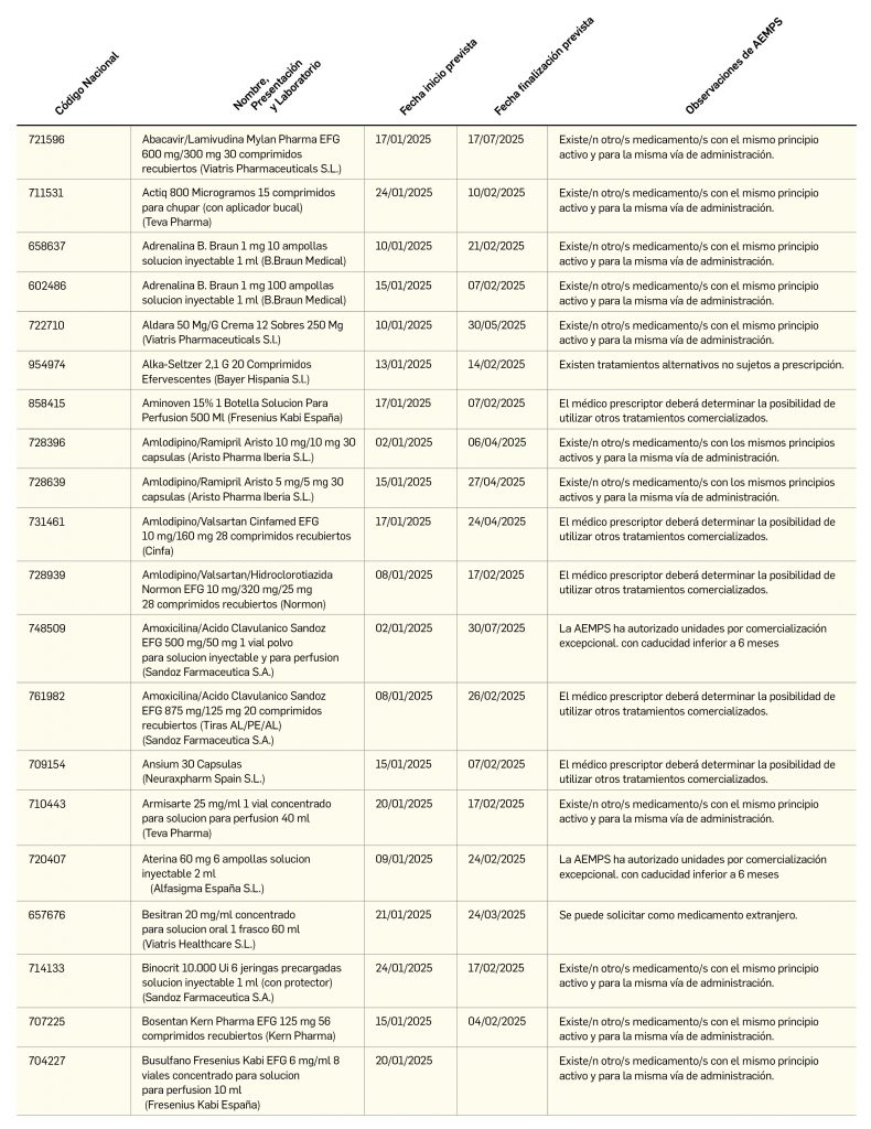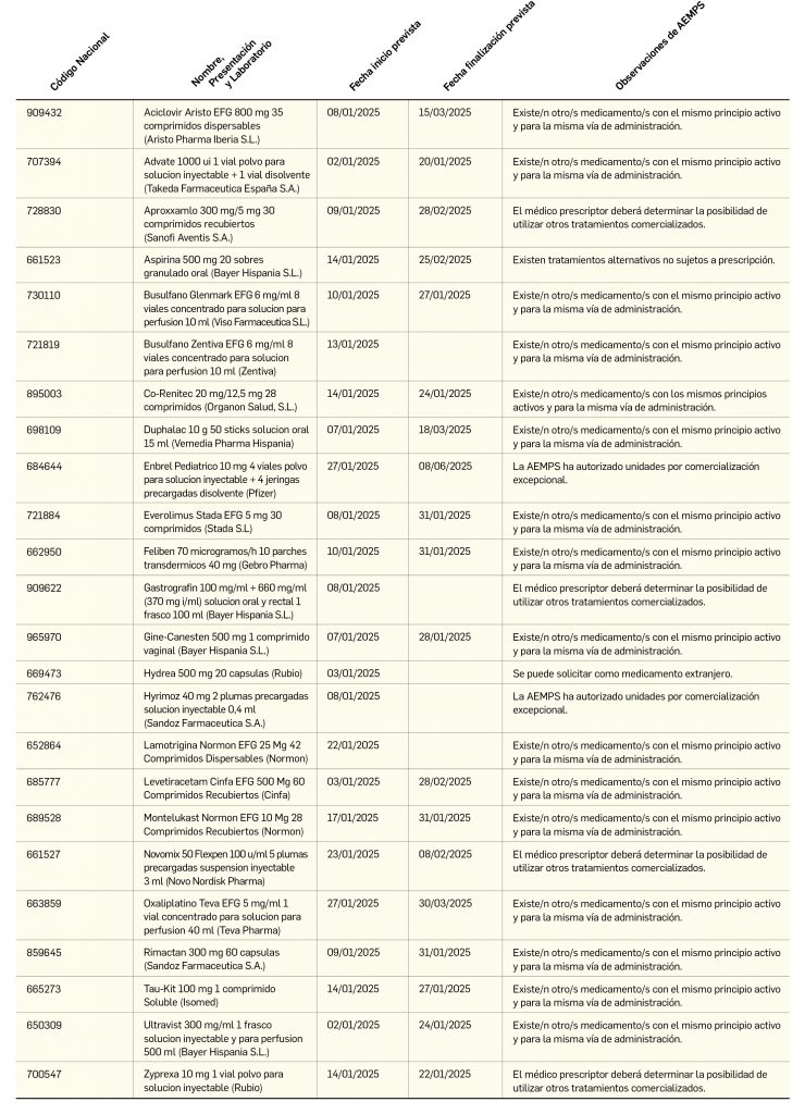 Listado de medicamentos con problemas de suministro publicado por la AEMPS, a fecha de cierre de este número. En BOT PLUS se puede encontrar la información completamente actualizada, al tratarse de una información que varía de forma continua.