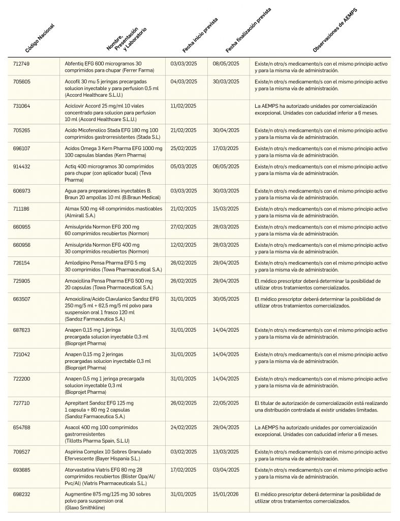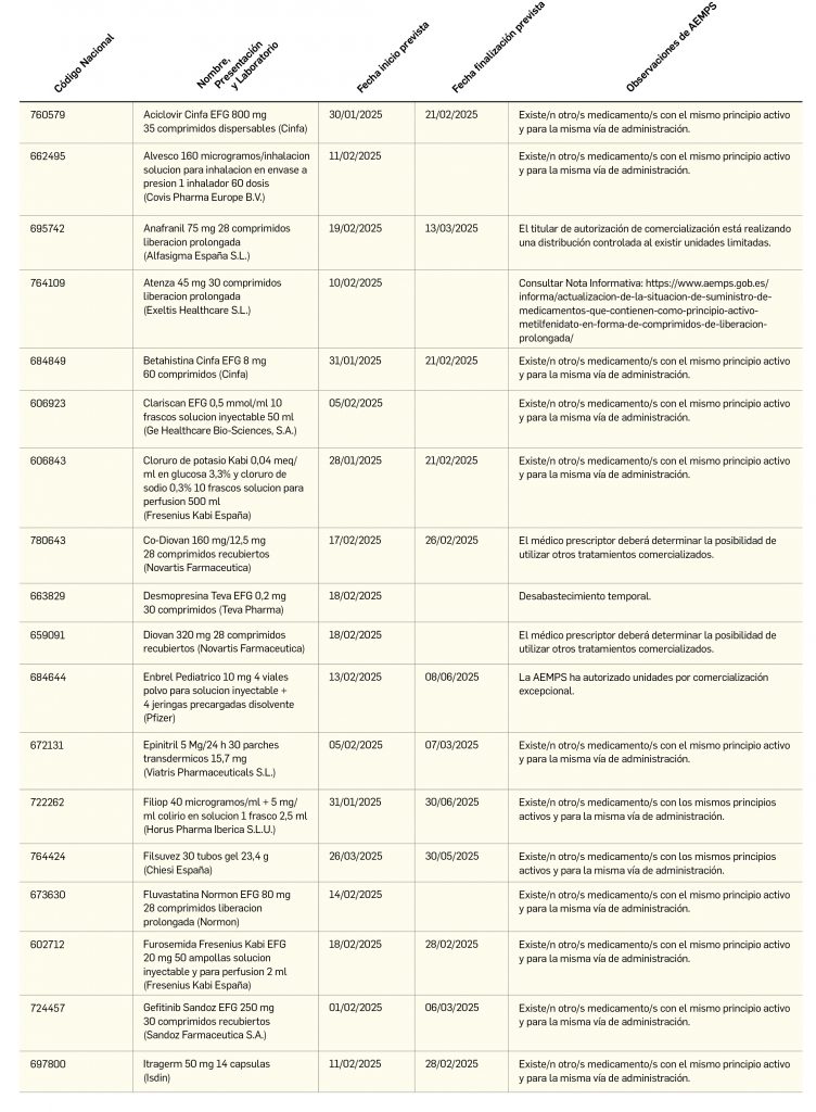 Listado de medicamentos con problemas de suministro publicado por la AEMPS, a fecha de cierre de este número. En BOT PLUS se puede encontrar la información completamente actualizada, al tratarse de una información que varía de forma continua.