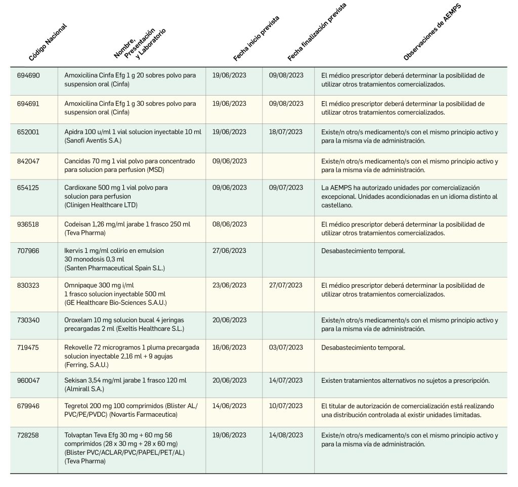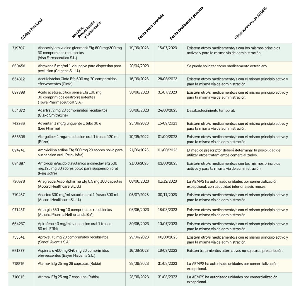 Listado de medicamentos con problemas de suministro publicado por la AEMPS, a fecha de cierre de este número. En BOT PLUS se puede encontrar la información completamente actualizada, al tratarse de una información que varía de forma continua.