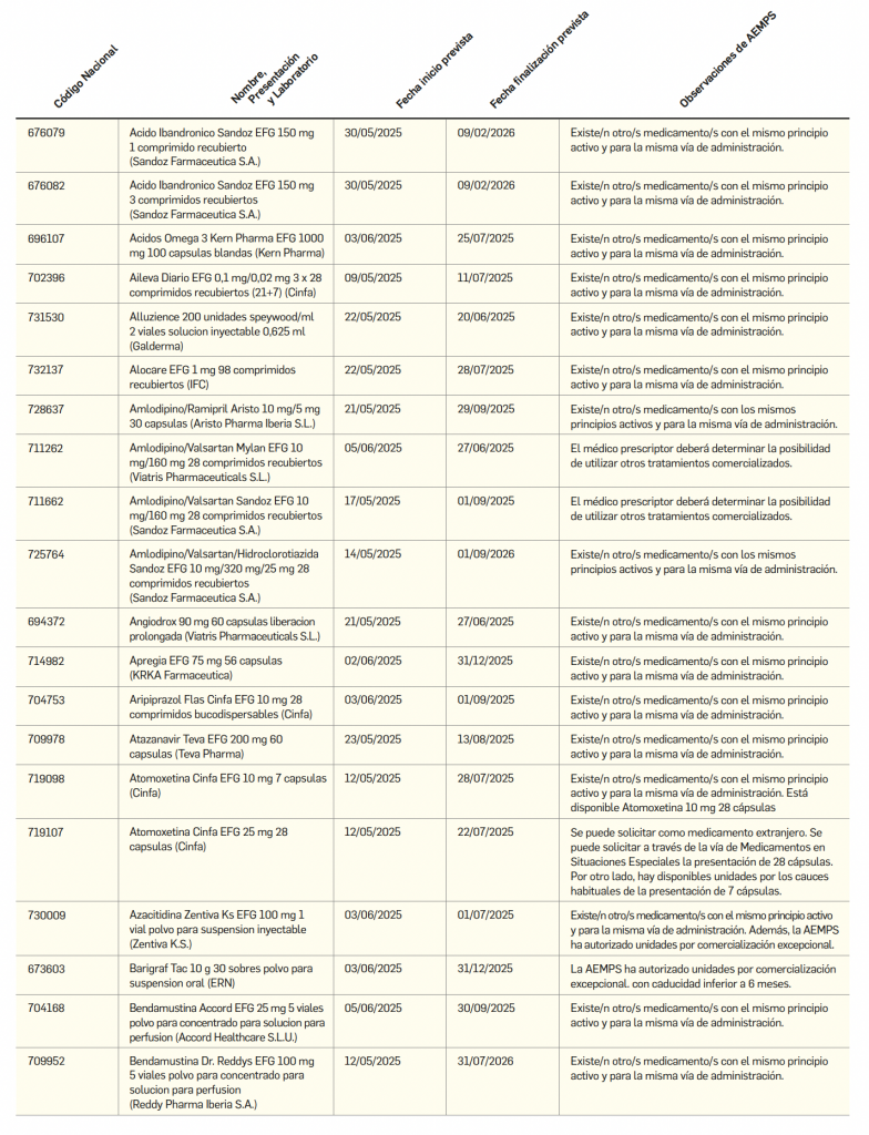 Listado de medicamentos con problemas de suministro publicado por la AEMPS, a fecha de cierre de este número. En BOT PLUS se puede encontrar la información completamente actualizada, al tratarse de una información que varía de forma continua.