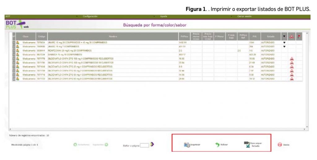Los listados generados con estos buscadores, al igual que todos los listados de BOT PLUS, se pueden imprimir o exportar, pinchando en los botones situados en la parte inferior de la pantalla (Figura 1).
