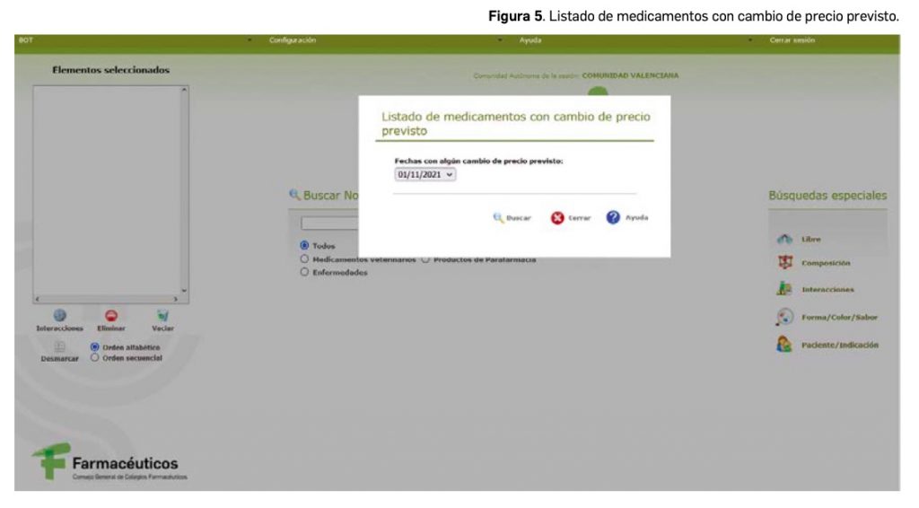 Otro listado de interés, para la gestión de la farmacia comunitaria es de los medicamentos que tienen previsto sufrir un cambio de precio. Esta información la tenemos disponible dentro de medicamentos de uso humano, “listado de medicamentos con cambio de precio previsto” (Figura 5).