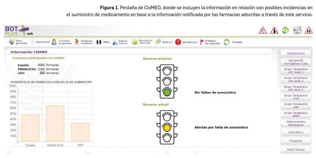 Esta información va a ser incluida en BOT PLUS (Figura 1), permitiendo la consulta de la misma por parte del usuario, de modo que le permita conocer la información relativa a estas posibles incidencias en el suministro de medicamentos, informándole del número de farmacias que han notificado faltas en el suministro, tanto a nivel provincial como autonómico y nacional, así como la situación actual y en la semana anterior.